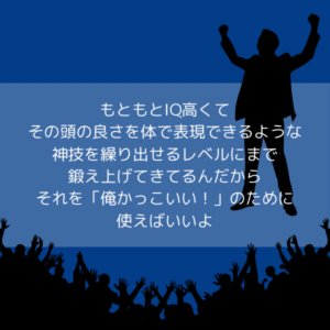 もともとiq高くて その頭の良さを体で表現できるような 神技を繰り出せるレベルにまで 鍛え上げてきてるんだから それを「俺かっこいい!」のために 使えばいいよ-2-1