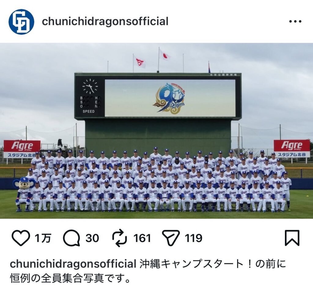 【中日】ドアラの左耳が田島慎二コーチの顔に…球団創設90周年の集合写真(スポーツ報知)